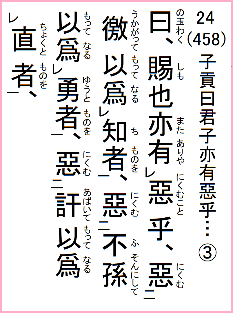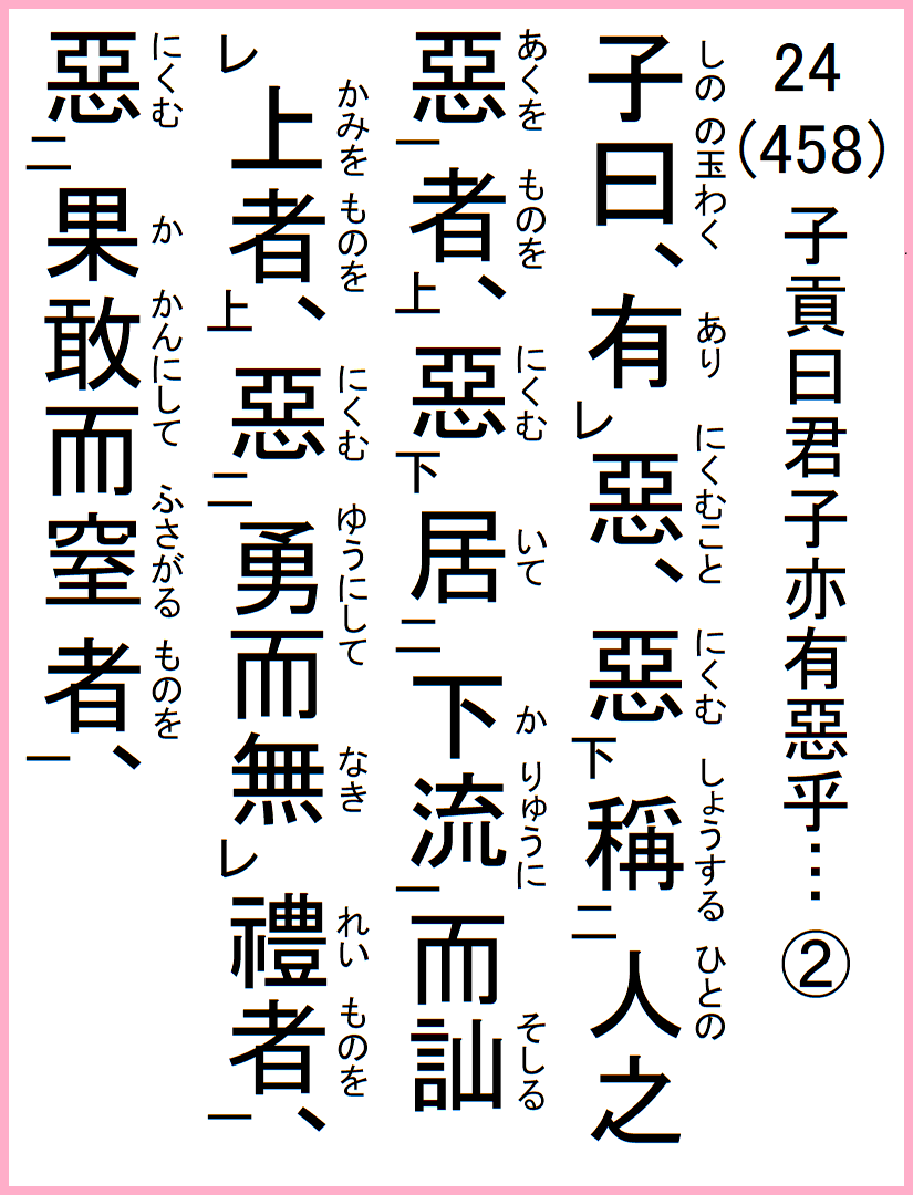 子の曰く、悪むこと有り、人の悪を称する者を悪む、下流に居て上を訕る者を悪む、勇にして礼無き者を悪む、果敢にして窒がる者を悪む、