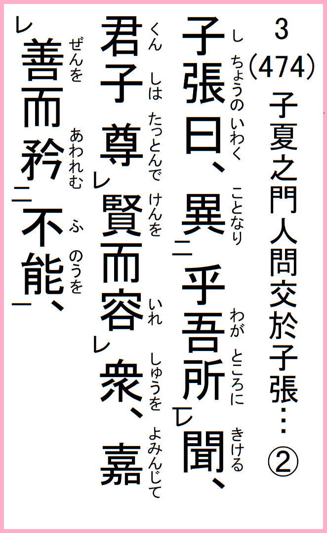 子張の曰く、吾が聞ける所に異なり、君子は賢を尊んで衆を容れ、善を嘉みんじて不能を矜れむ、