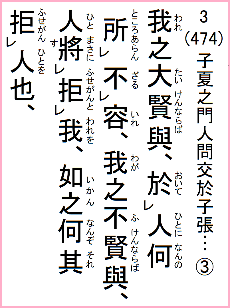 我が大賢ならば、人に於いて何の容れざる所あらん、我が不賢ならば、人将に我を拒がんとす、如之、何ぞ其れ人を拒がん、