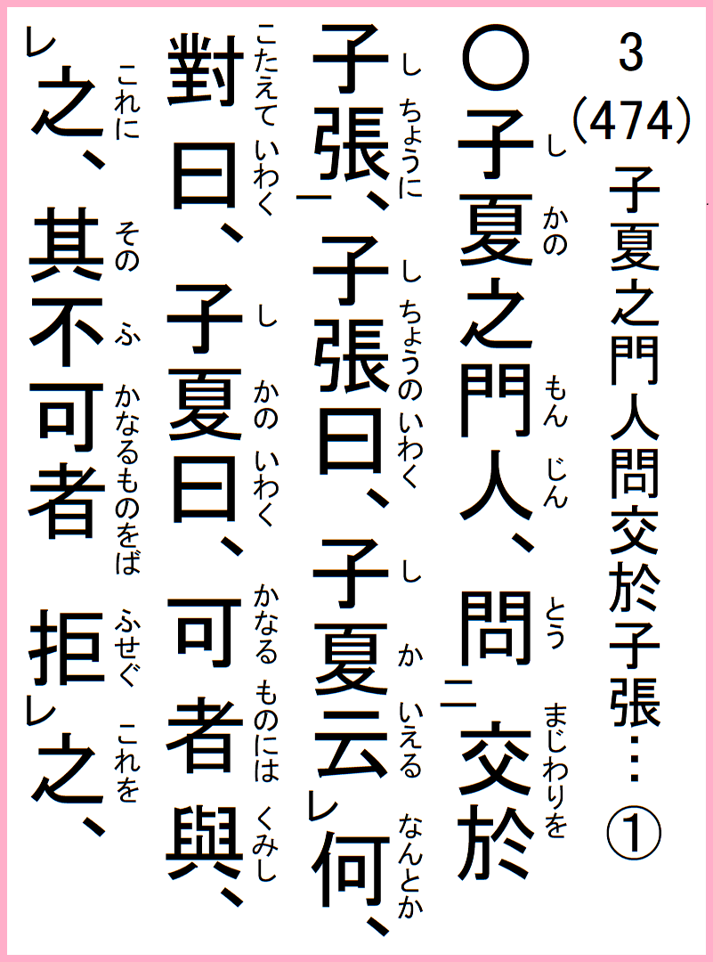 子夏の門人、交わりを子張に問う、子張の曰く、子夏何とか云える、対えて曰く、子夏の曰く、可なる者には之に与し、其の不可なる者をば之を拒ぐ、