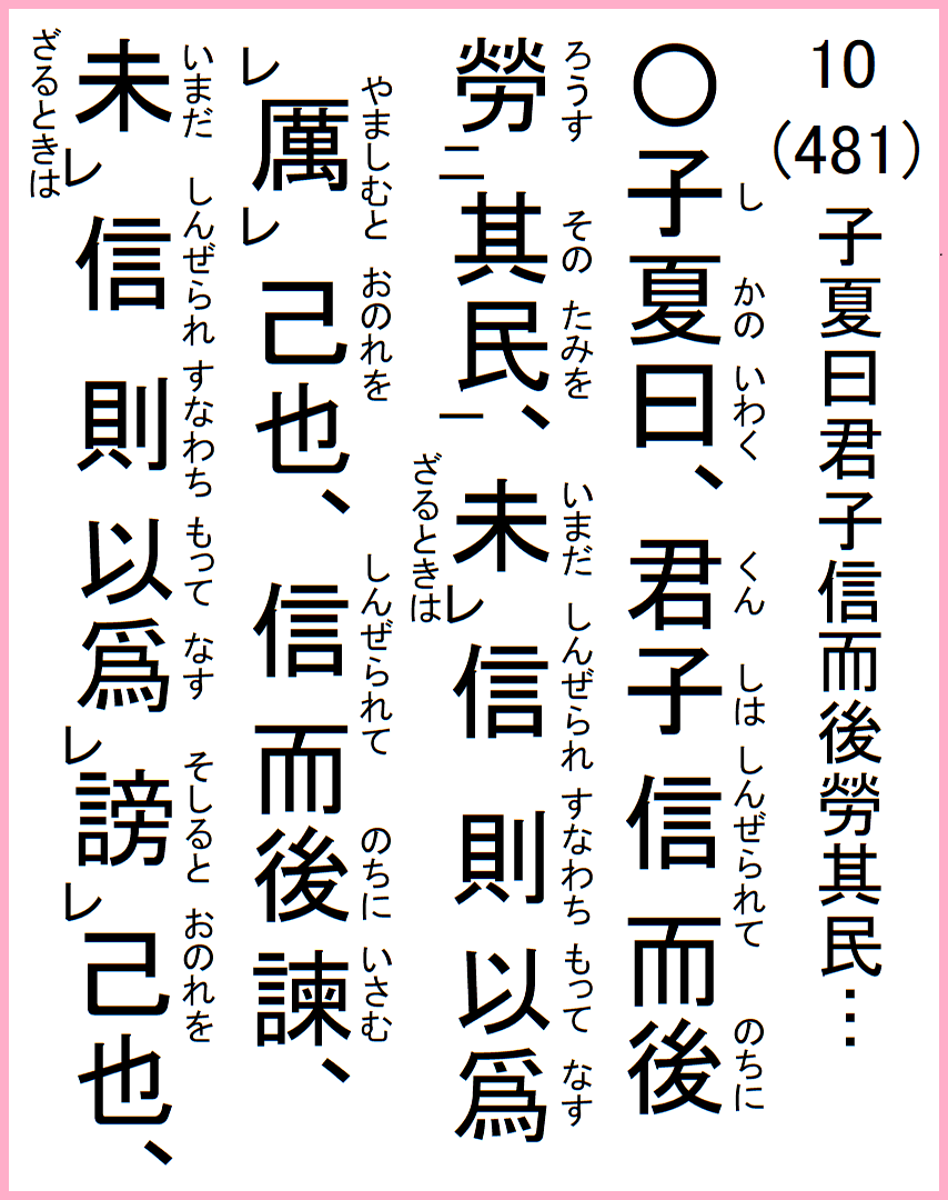 子夏の曰く、君子は信ぜられて後に其の民を労す、未だ信ぜられざるときは則ち以って己を獅オむと為す、信ぜられて後に諌む、未だ信ぜられざるときは則ち以って己を謗ると為す、