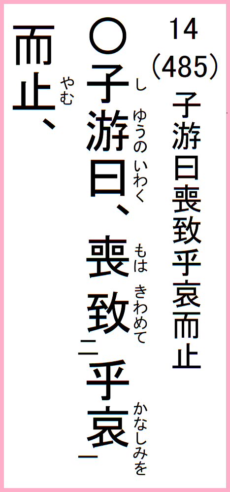子游が言った。喪は哀しみを極めることが大事で、儀礼的なことで大袈裟に飾る必要はない。