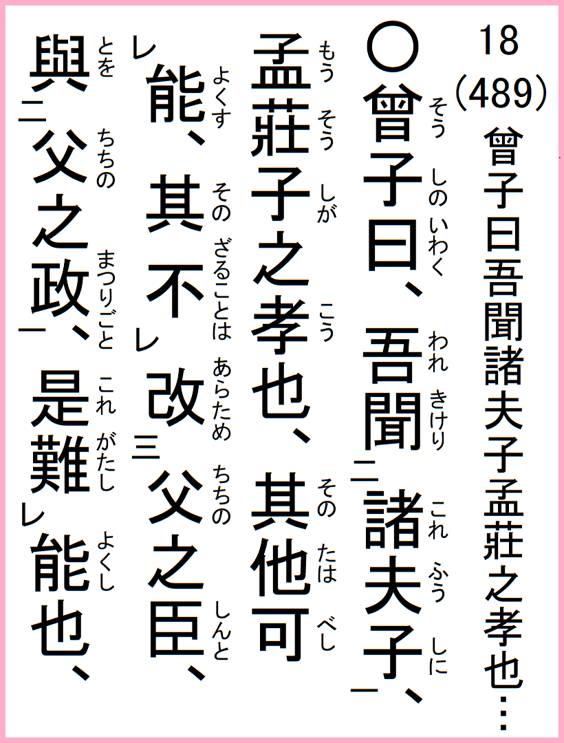 曽子が言った。私は先生から次のことを聞いた。孟荘子の孝行は、他のことなら真似できても、父の死後に臣と政を改めなかったことは、なかなか真似できるものではない。