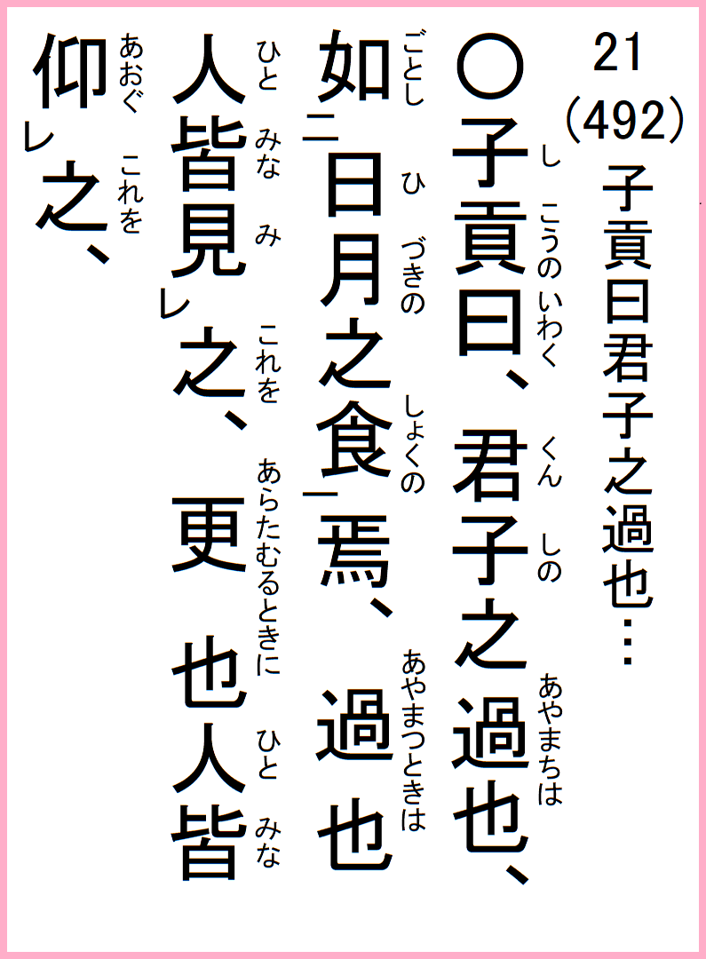 19-21 子貢曰、君子の過ちは、日月の食の如し、過つと…