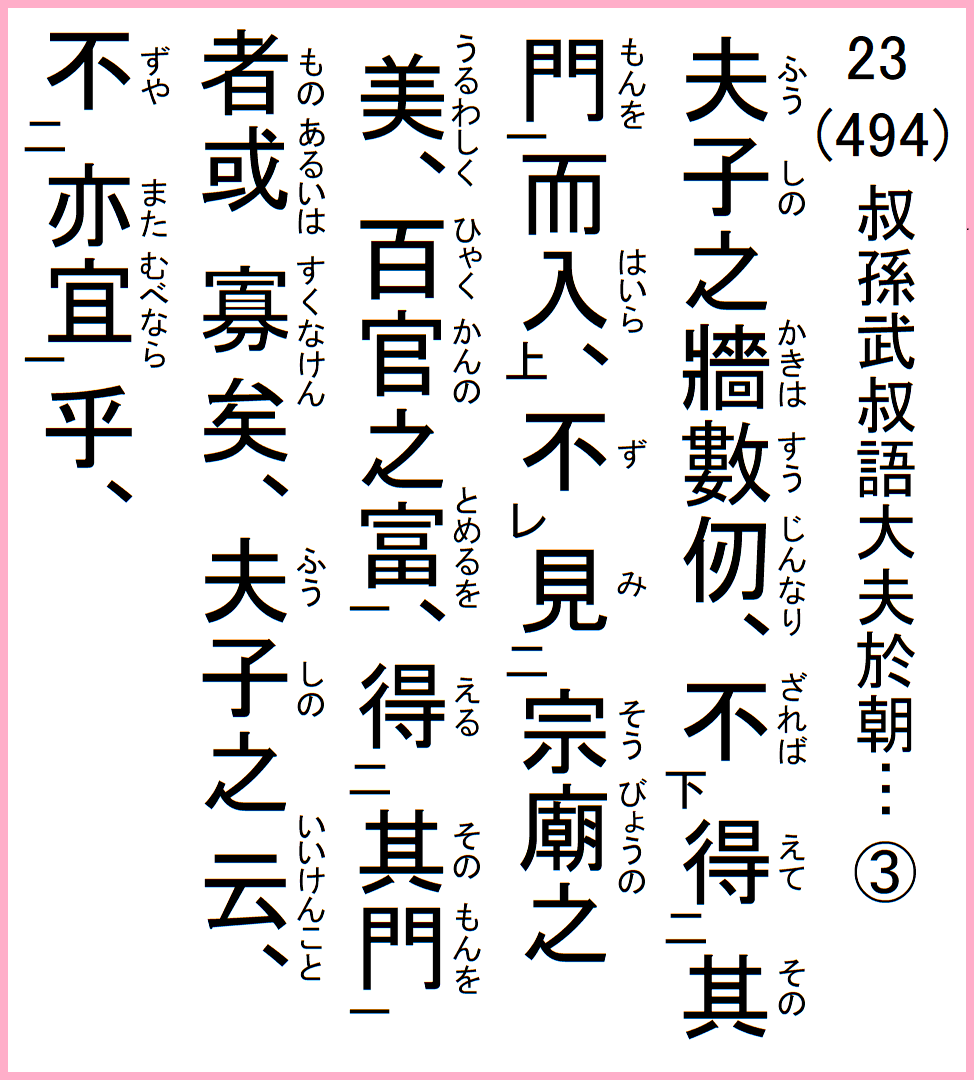 先生の塀は約十メートル程度あり、ちゃんと門から中に入らないと、そこにある宗廟の美しさや、文武百官が備わって盛んな様子は見ることができません。しかしながら、その門の場所を探し出して入ろうとする人はとても少ないようです。武叔があのように云ったのは、その門を探し出して入ったことがないからであって、それならそう思っても当然でしょう。
