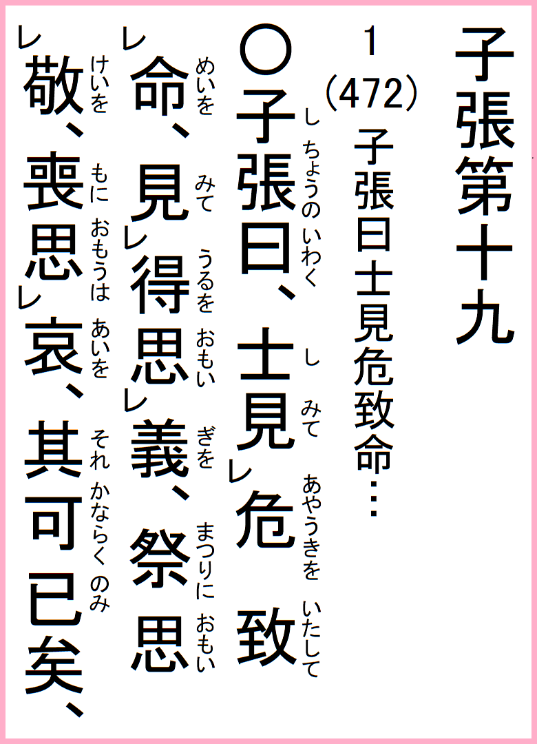 子張が言った。士というものは、仕える君の危難を見たら自らの命を惜しまず救う。何かを貰うときは、義に適うか不義かを詳らかにして、卑しく悖るようなことはしない。祭りには心からの敬意を込める。喪には心からの哀しみを込める。このようであってこそ、士と称することができるのだ。