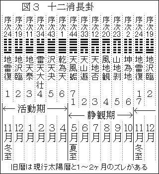 C序次24地雷復を絶妙に展開して☆地雷復の卦の形の読み解き方 第8章に先だって、天地創造と序次との関係を、ほんのサワリだけ述べておく。とりあげる序次は、序次64 ☆言葉とコミュニケーション かつての日本人と違って現代の日本人は、こういう説明に出会うと困惑してしまう。欧米の言語と論理で教育されると、火はファイアであり光はライトでなければならないと思ってしまう。まして「水の上の火」という図形記号に出会えば「やがて火は消える」と解釈したくなる。だが、こういうセンスでは、易学の展開ストーリーと論理を、まったく理解できなくなる。 ☆陰陽記号の二面性 易学には陰⚋と陽⚊の二種の記号しかない。この意味で区分・区分け・限定という言葉の機能を保つことができるのであるが、他方で六十四卦に展開してイメージを自在に押し広げるという機能も合わせ持つようにしてある。 ☆天神相関 この場合、勝手に八つの記号を組み合わせたのでは混乱してしまう。そこで、いくつかの約束事が設定され、さらに変化の意義や意味をしっかり説明できるようにするために、時の推移を示す十干十二支などを併用した。 ☆地雷復の意義 話は易学論になってしまったので、天地創造神話の卦に話を戻そう。 ☆「十二消長卦」 まず、天地創造神話といったん離れて、図3を見ていただきたい。これは、六十四卦の序次=順番を無視して、⚋・⚊という記号の増減の図形上の推移を、秩序だてて配列したものである。六十四卦から十二卦をピックアップして配列してある。