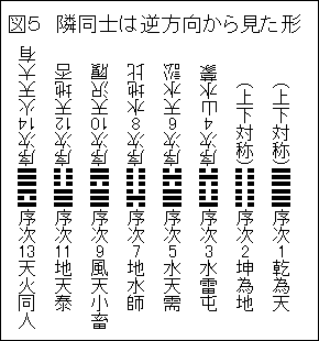 この二つの卦は、一方を逆方向から見た形になっているのだが、こればかりではなく、一日目の序次3と4、三日目の7と8、四日目の9と10、五日目の11と12、六日目の13と14の関係も同様である。図5のとおりである。