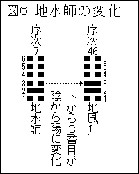 序次7䷆の図形記号の下から三番目が陰⚋から陽⚊に変化した形は、序次46䷭地風升である(図6参照)。地風升の中心的な意義は、「蒔かれた大木の種子」である。少し説明を加えると、大木というのは植物全般の象徴的な表現であり、草でも果樹でも大木でも、とにかく植物は種を蒔くとやがて芽を出して成長する、ということである。ちなみに序次8䷇の下から三番目を変化させると序次39䷦水山蹇となり、中心的な意義は「松葉杖での山登り」である。これはちょっと創造に相応しくないので却下したのだろう。