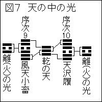 序次9䷈風天小畜と序次10䷉天沢履は、天の中に光がある形で、その光の位置が両卦でちょっとずれているのだ。図7で確認してほしい。したがって、この両卦を合わせると、太陽、月、星の運行を象徴するのである。