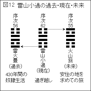 次に、説明を省くが、これは序次62雷山小過を中心にした時間の経過による卦の変化に照応しているのである。過去・現在・未来に分けて卦を展開していくのである。