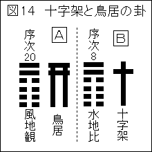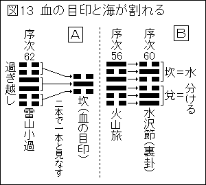 3 62䷽雷山小過は、構成する記号を二本で一本と見なして☵坎の意味も含むとされ、その坎には身体の中を流れる液体として「血」の意味があるから、物語にある"神はイスラエルの民の家の戸口にある血の目印を過ぎ越した"に照応する。図13A。なお、二本で一本であることから、俗に大坎とも呼ばれ、同様に、19䷒地沢臨は大震、20䷓風地観は大艮、33䷠天山遯は大巽、34䷡雷天大壮は大兌、61䷼風沢中孚は大離と呼ばれてもいる。