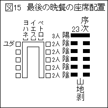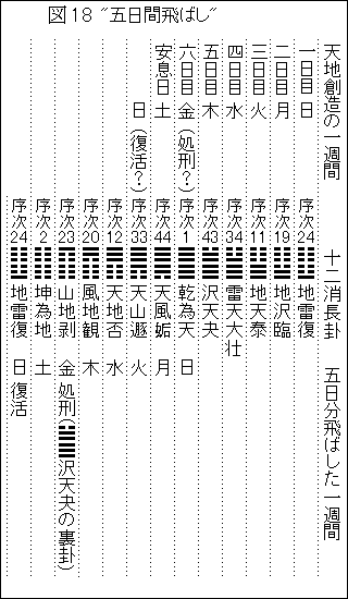ペトロの鶏のエピソードでは、序次12天地否と序次33天山遯が示されているが、これは「天山遯の否定」すなわち「復活の日は序次33天山遯ではないゾ」を示していたのである。もっと言えば、「天地創造に依存した一週間十二消長卦の配置を動かして、復活の日を天山遯ではなく、復活に最もふさわしい序次24地雷復とせよ」、ということである。こうすると処刑日は、序次23山地剥=「山崩れの危険」で、最後の晩餐の座席配置の卦となるとともに、その裏卦は処刑そのものの沢天夬だから、ストーリー展開とピッタリになる。図18下段のように、五日分移動させるのである。言ってみれば、"五日間飛ばし"である。この解読手法は、定石化されたものでも、解読技術として明記されているものでもない。強いて言えば、易学を知悉する者同士の暗黙の習慣・作法のようなものである。アドバイザー氏はその習慣に依存して、ペトロの鶏のエピソードを挿入したことになる。